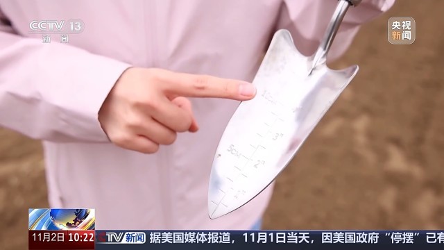 这儿是河北邢台的一处麦田,2.2万亩的冬小麦正在赶紧耕种,耕种往后,农人会用带尺子的小铲子丈量耕种深度。本年由于土壤偏湿,气温偏低,耕种深度比正终年份要浅上1到2厘米。这样种子能够早萌生,快出苗。一经发现种子播得深了,就要及时作出调整耕种机。